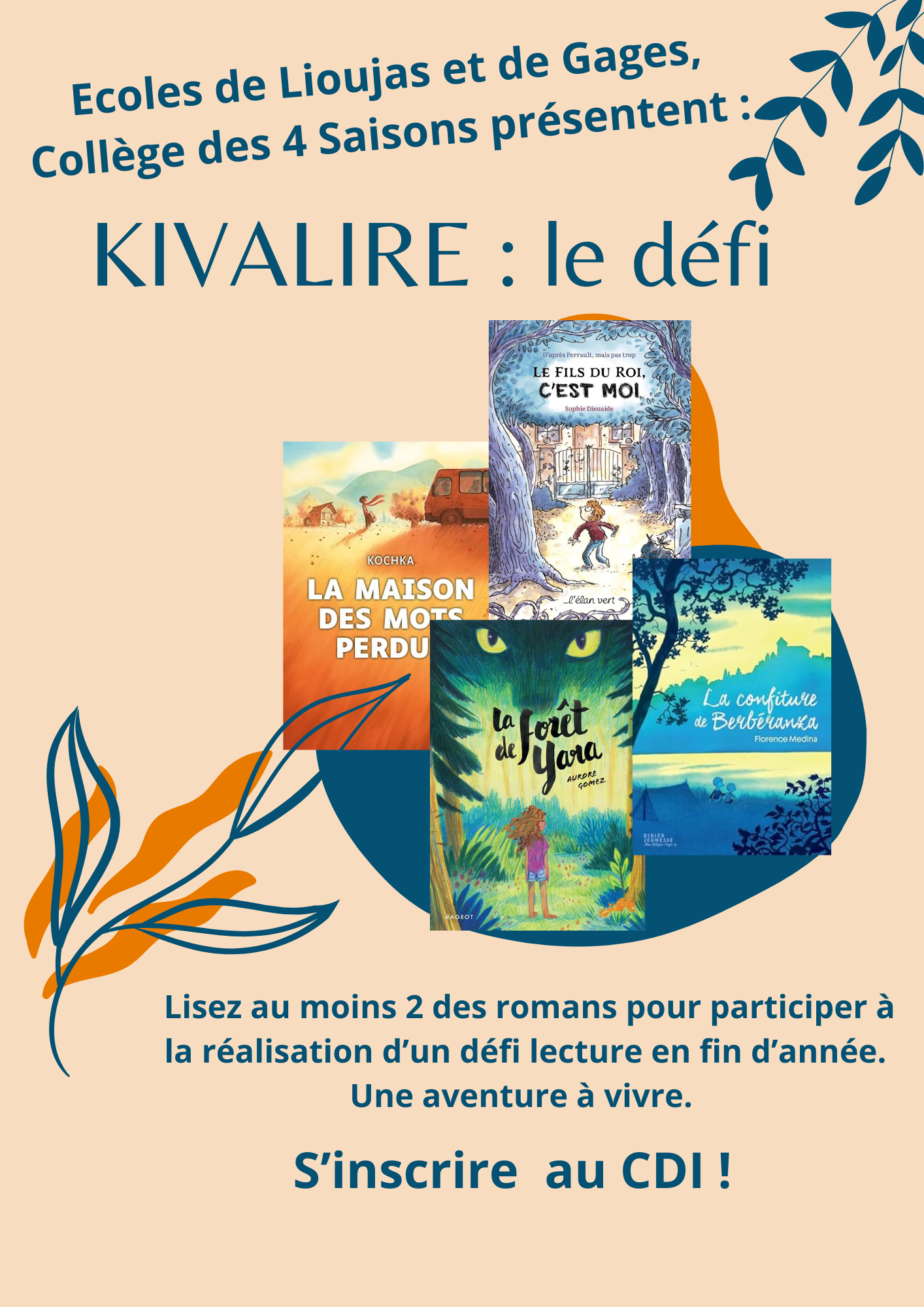 KIVAlire , un défi lecture proposé par le professeur documentaliste à tous les élèves de 6ème du collège. les professeurs des écoles de LIOUJAS et de GAGES le proposent aussi à leurs élèves. 4 romans récents sont à lire jusqu'au mois de mai.